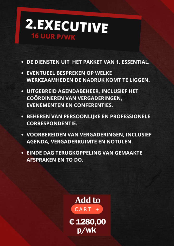 De onderstaande secretariële diensten kunnen afzonderlijk of gezamenlijk worden besteld, afhankelijk van jouw wensen en behoeften. Nadat je zorgvuldig een secretariële dienst aan het winkelmandje hebt toegevoegd, heb je de mogelijkheid om het aantal uren per week te selecteren. Bij het tekstveld kun je aangeven voor hoe lang je deze dienst wilt inzetten. Bij het afrekenen zijn er twee handige opties beschikbaar: 1. Betalen met iDeal met 5% korting en met creditkaart 2% korting) bij afrekenen. of 2. Een rekening ontvangen, zodat je deze later kunt afhandelen. Het is belangrijk dat je de keuze maakt die het beste bij je past.